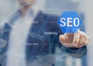 Search Engine Optimization consultant touching SEO button on whiteboard